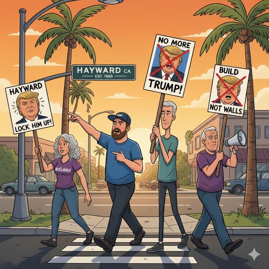 The cartoon at the top of this Substack—of anti-Trump demonstrators in Hayward—was created by AI, ChatGPT, with instructions from Sean. As he says, it’s easy to create similar cartoons which you can turn into posters: Go to the App Store. Get the free ChatGPT app. Type in or say something like: Make a cartoon of four anti-Trump demonstrators in Hayward, and bingo. He also created and printed the poster he’s holding below.