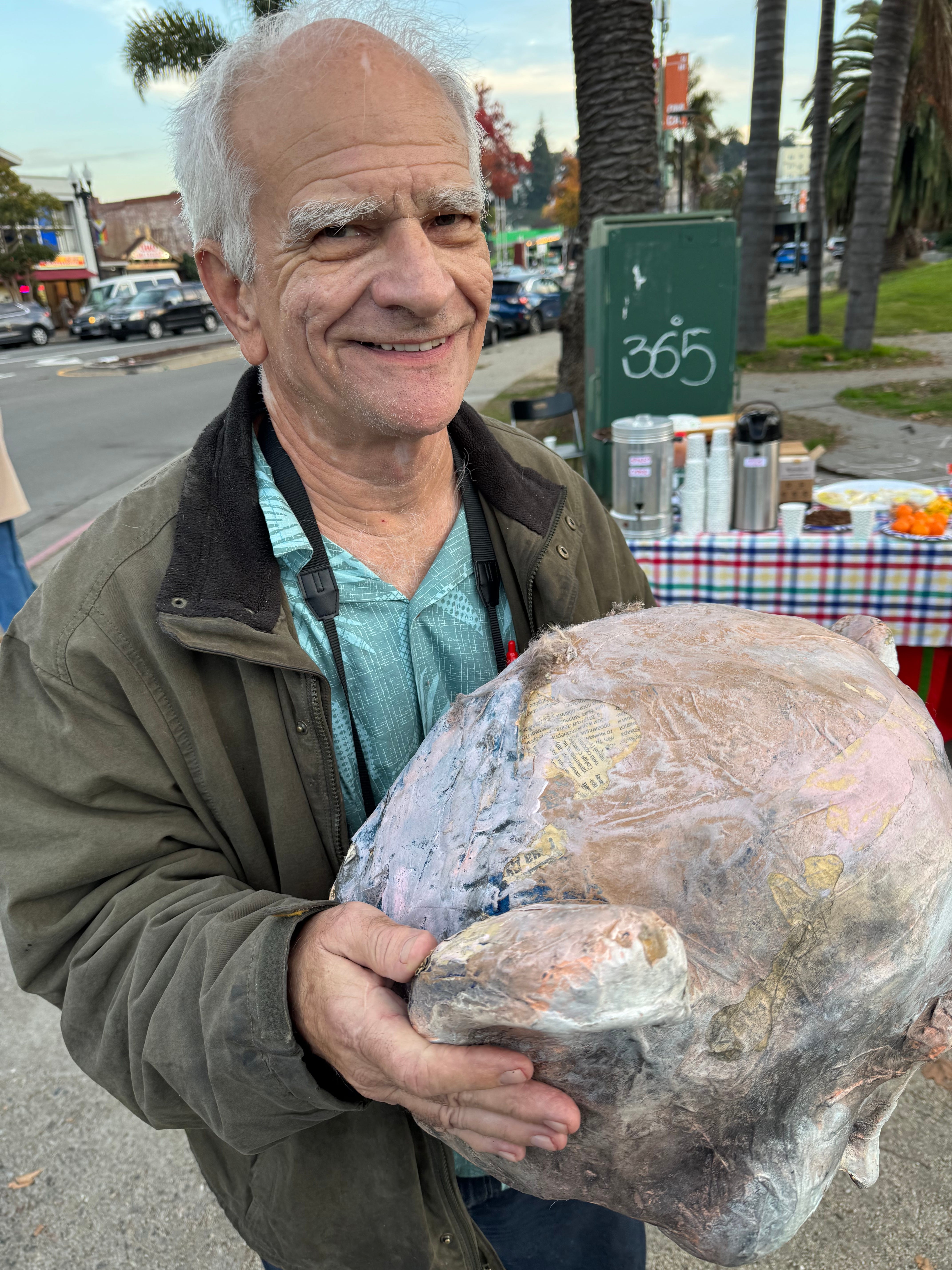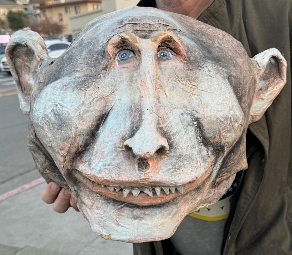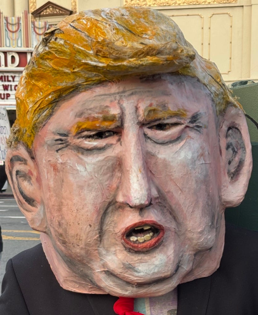 Their performance in San Francisco included both the Trump and Putin masks which were made by an art collective in the Bay Area. The collective included them Zabrina Zabrisky, a courageous activist from Russia. Zabrina now works as a journalist with By Line News covering the war in Ukraine was part of the group. You can read her reporting here. BY LINE TIMES. The art collective made the paper mache masks—you can see the Russian language newspaper showing through Putin’s paper-thin skull if you enlarge the final picture below.
