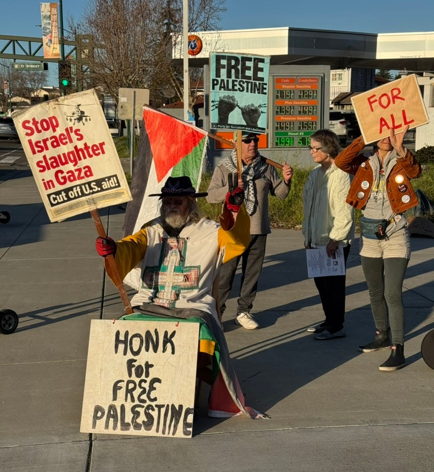 In Hayward, there is a Pro-Palestine demonstration (Avenue D at the 76 Gas Station) down the block from the weekly demonstration against Trump (Mission and B Street), both at 4 pm.
