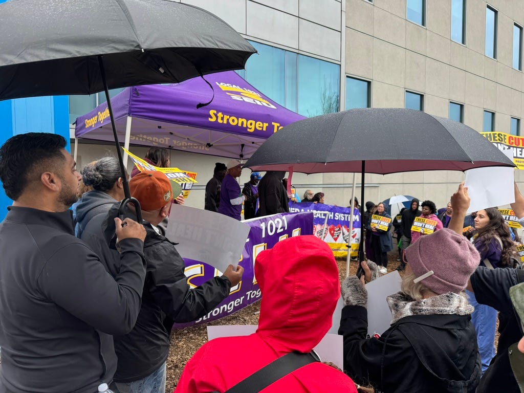 SEIU Local 1021 at Wilma Chan Highland Hospital on February 11, 2026, held a “Stop the Cuts” rally to fight against planned “catastrophic” layoffs and service reductions. Despite the rain, 100 people were there on their lunch break.