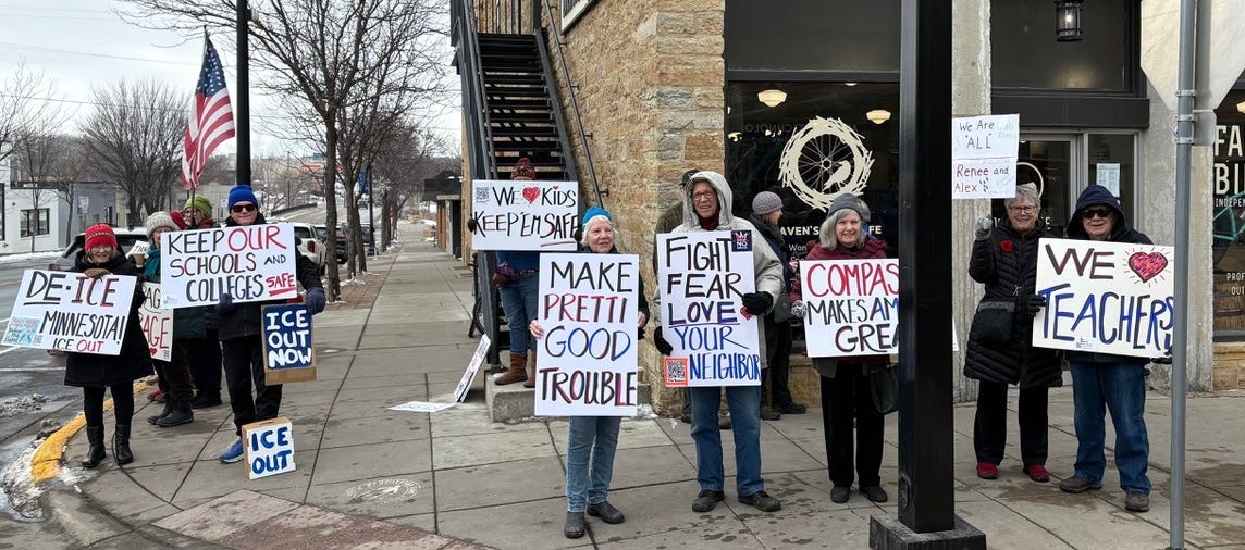 The Beacon in Northfield started with me alone downtown, promoting compassionate democracy. Another friend joined; we grew to about 2 to 6 folks every Thursday, until the murder of Renee Good, when the demonstration grew to 16-18 folks every week.
